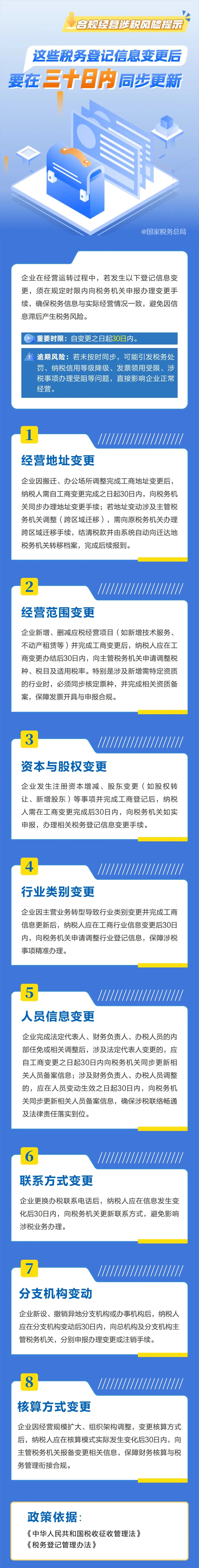 在复杂多变的市场环境中,企业为适应发展,其经营地址、股权结构、经营范围等登记信息发生变更是常态。然而,许多经营者往往专注于工商手续的完结,却容易忽略紧随其后的关键一步——向税务机关同步更新信息。近日,国家税务总局发布的合规经营提示海报,以醒目的蓝黄配色与清晰的条列,为企业敲响警钟:自任何税务登记信息变更之日起,企业仅有三十日的“黄金窗口期”完成同步更新。 这并非简单的流程提醒,而是维系企业健康血脉、防范系统性风险的“生命线”。